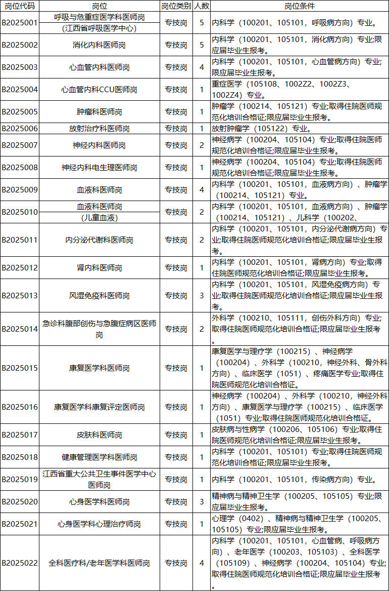 8.报考医师、护理岗位的考生需取得相应的初级专业技术资格,特殊情况见岗位条件栏。应聘者应于2025年11月30日前取得资格证。要求取得住院医师规范化培训合格证的岗位,2025年规培结束但未参加结业考试的人员可报考,报考人员应于2025年11月30日前取得合格证。